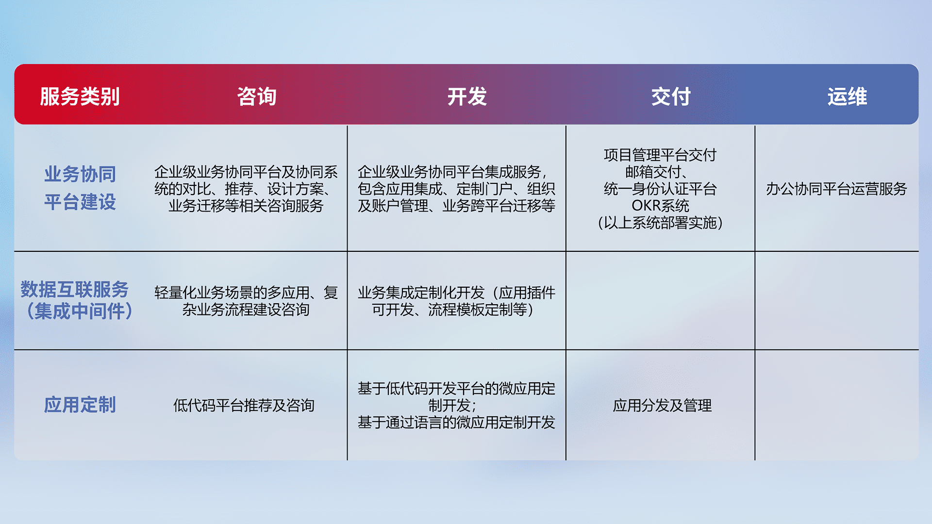 针对钉钉、、企微、、IDaas等平台级产品提供产品的规划、、、方案、、、交付、、定制化开发等服务,,,,实现如统一协同办公、、、智能客户服务、、、混合会议管理、、、、智能数据查询、、、、等业务场景,,,,实现数字化转型。。